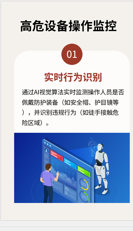 在高危设备操作区域,伟风智能利用AI视觉算法,实时监测操作人员的行为动态。系统能够精准识别操作人员是否佩戴了必要的安全防护装备,如安全帽、护目镜等,有效防止因人为疏忽导致的安全事故。同时,它还能识别徒手接触危险区域等违规行为,并立即发出警报,确保操作人员的安全。