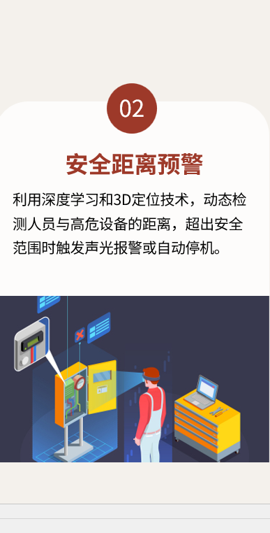通过深度学习和3D定位技术,伟风智能能够动态检测人员与高危设备之间的距离。一旦人员超出预设的安全范围,系统会立即触发声光报警或自动停机机制,有效防止因人员靠近危险区域而引发的安全事故,为企业的安全生产加上一道科技锁。